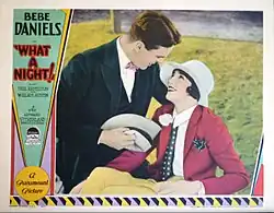 What a Night! is a 1928 American silent romantic comedy film directed by A. Edward Sutherland. The romantic comedy was written by Louise Long, from a story by Lloyd Corrigan and Grover Jones. The film stars Bebe Daniels, Neil Hamilton, and William Austin.[1][2]