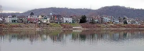 ![]() Buildings on Wheeling Island as viewed across the east channel of the Ohio River from downtown Wheeling in 2006. The hills in the background are in Belmont County, Ohio. | |