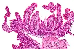 Diagnosis is made by biopsy, usually by duodenal endoscopy, which reveals PAS-positive macrophages in the lamina propria containing non acid-fast, Gram-positive bacilli.[5][a] Immunohistochemical staining for antibodies against T. whipplei has been used to detect the organism in a variety of tissues, and a polymerase chain reaction-based assay is also available,[5] which can be confirmatory if performed on blood, vitreous fluid, synovial fluid, heart valves, or cerebrospinal fluid.[11] PCR of saliva, gastric or intestinal fluid, and stool specimens is highly sensitive, but not specific enough, indicating that healthy individuals can also harbor the causative bacterium without the manifestation of Whipple's disease, but that a negative PCR is most likely indicative of a healthy individual.[5]