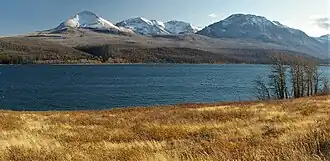 Divide Mountain (left), White Calf Mountain (center), Curly Bear Mountain (right) seen with Saint Mary Lake