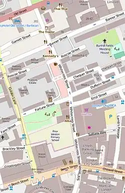 The street is located in St Luke's, Islington. It runs north–south, between Old Street in the north, where it abuts St Luke Old Street, and the junction with Beech Street (west), Chiswell Street (east) and Silk Street (south, continuing the street) in the south. The southern junction marks the boundary with the City of London: Whitecross and Chiswell (north and east) are in Islington, while Beech and Silk (west and south) are in the city.