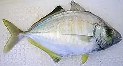The whitefin trevally is a commercially important species in the waters off Japan, where it is known as kaiwari (カイワリ), and of minor importance elsewhere throughout its range.[5] For unknown reasons, the Japanese catch has decreased by half since the mid-1980s.[10] It is taken primarily by bottom trawls on the continental shelf and considered to be a good table fish.[5]