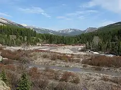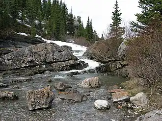 At its origin, inside Whitehorse Wildland Provincial Park located just east of Jasper National Park, Whitehorse Creek forms from the meltwater of Mount Gregg and Mount Bryant.[3] The creek flows east, taking on the tributaries of Harlequin Creek and Drummond Creek, before its confluence into the Mcleod River on the east side of the Whitehorse Creek Provincial Recreation Area.[3] The elevation of Whitehorse Creek at its confluence with the McLeod is 1,600 m (5,200 ft). Whitehorse Wildland Provincial Park includes a trail network for hiking and horseback trail riding.[1]