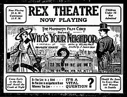 Willard Mack had registered and copyrighted "Who's Your Neighbor?" on March 9, 1917.[5] Speculation by Motography states that Mack's "contribution to the screen drama was probably prompted by the distressing Ruth Cruger mystery, which was so cleverly solved by Mrs. Grace Humiston, and follows very closely many of the phases of drama in real life that shocked the world."[6] The April 17, 1917 issue of Motography profiled the film, the first production of Master Drama Features, noting that it would be shown on a "stage-right" basis after a New York City premier at a Broadway theater.[7] H. D. Fretz noted that the majority of the scenes were shot indoors and described the photography as excellent.[3] The film was described as breaking a record by Motoplay because of the use of a triple exposure. The brief note stated that it is a delicate and precise work that required perfect synchronization that "(the film) had to be taken twenty times before the result was satisfactory to Director S. Rankin Drew."[8] Who's Your Neighbor? was the first film produced by Edward Small.[9] According to the American Film Institute, the film was edited by Frank Lawrence.[10]