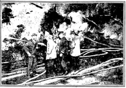 Five firemen had a narrow escape ... Chief Lips and four assistants were playing a hose through the broken window when the flames took a new tack and swept over them. The Chief and three men escaped down the ladder. Oscar Jones of Company No. 6 wa driven to a corner of the platform, and cut off from the ladder by a sheet of flame. He jumped to a near-by line of hose which had been carried to the roof and escaped by sliding to the ground. He was singed about the head and face. The immense crowd cheered him as he lowered himself by means of the hose.[6]