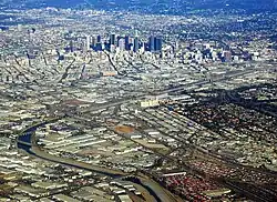 The Wholesale District lies across the middle of this 2009 photograph, above the Los Angeles River and below Downtown Los Angeles