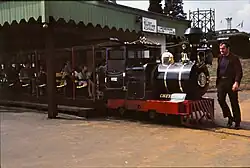 ![]() Locomotive "Merlin" hauling a passenger train on the Wicksteed Park Railway | |