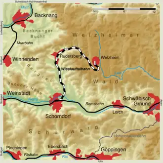 The Wieslauf Valley Railway (German: Wieslauftalbahn) is a branch line in the Stuttgart region of the German state of Baden-Württemberg. It is single-track and standard gauge, and was originally 22.8 km (14.2 mi) long, connecting the main Remsbahn line at Schorndorf to Welzheim. Today it is operated in two sections, with the first 11.5 km (7.1 mi) from Schorndorf to Rudersberg served by a regular passenger service, whilst the final 11.3 km (7.0 mi) forms a steam operated heritage railway.[1]