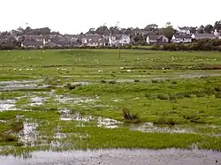 The bay is broadly triangular in form, widening to the southeast and with the estuary of the River Cree entering from the northwest at its head. The inner parts of the bay are characterized by large expanses of salt marsh and mudflats.[1] The River Bladnoch flows into the estuarial section of the Cree near Wigtown. The Water of Fleet is a third significant river which enters Wigtown Bay via Fleet Bay on its eastern shore. At the mouth of Fleet Bay are the Islands of Fleet include Ardwall Island, Barlocco Isle and Murray’s Isles.[2] The western shore of the bay is formed by The Machars peninsula. This coast is itself indented by Rigg (or Cruggleton) Bay and by Garlieston Bay on which the village of Garlieston sits. The small town of Wigtown also stands on the western shore of the bay whilst the village of Creetown lies at the head of the bay.