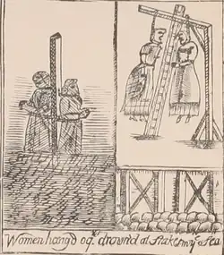 The Wigtown Martyrs or Solway Martyrs, Margaret Maclauchlan and Margaret Wilson, were Scottish Covenanters who were executed by Scottish Episcopalians on 11 May, 1685 in Wigtown, Scotland, for refusing to swear the Oath of Supremacy declaring James VII of Scotland as head of the church. They were tied to stakes on the town's mudflats and allowed to drown with the rising tide.[2][3]