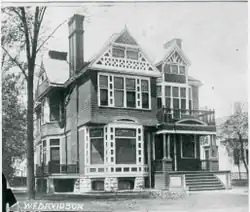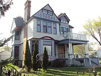 The Wilbur F. Davidson House is a two and one-half story frame Queen Anne house. The first floor has clapboard siding, and scalloped shingles are above. Raised wood decorations on the gables creates a half-timbered effect.[2]