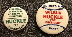 Huckle's reputation was presumably developed from spring training dispatches and broadcasts, augmented by the uniqueness of his name. In August 1964, during the Mets' first season at Shea Stadium, one of the winning entries in the team's annual banner contest, which drew over 1000 entrants, was "The Metropolitan Party Nominates Wilbur Huckle for President".[10][11] At the time, Huckle was in his second professional season, playing for the Double-A Williamsport Mets in Pennsylvania.[6] "Wilbur Huckle for President" campaign buttons from the era can occasionally be found on online auction sites.