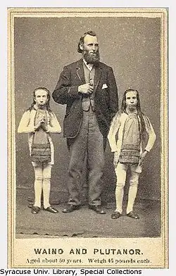 They were each 40 inches (100 centimeters) tall and weighed about 45 pounds (20 kg), yet could perform feats of great strength, such as lifting heavy weights and wrestling with audience members on stage. Discovered and promoted by a traveling showman known as Doctor Warner in 1852, Hiram and Barney were given new names, Waino and Plutanor, and a sensational backstory – they were said to be from the island of Borneo, where they had been captured after a great struggle with armed sailors. They initially had modest success, but at least one newspaper believed them to be dwarves from the United States.[3] The two were exhibited at state fairs across the United States. In the 1860 census they were living in Somerville, Massachusetts, in the household of Henry Harvey, a showman.[4] At some point in the next few years management of the pair was transferred to a relative of Doctor Warner, Hanford A. Warner.