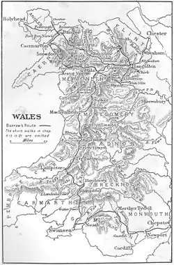 Borrow gives a detailed account of his journey and starts his travels into North Wales from Chester, passing en route through Wrexham, Llangollen, Corwen and Betws-y-coed to Bangor, Anglesey, Caernarfon, Bala, Machynlleth and then south, through Mid Wales to Tregaron and Lampeter, Devil's Bridge, Cwm Ystwyth and Pont-rhyd-y-groes, eventually arriving in some of the industrial areas around the South Wales coalfields, such as Brynamman, Merthyr Tydfil and Pontardawe, before visiting Swansea and Neath and leaving the country via Caerphilly, Newport and Chepstow.
