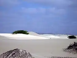 The Cape Verde archipelago, a cluster of 10 islands and three islets located in the eastern Atlantic Ocean at a distance of 560 kilometres (350 mi) off the coast of Senegal in West Africa, are volcanic in origin. Cape Verde is divided into two areas: the southern leeward islands known as the Sotavento Islands and the windward islands known as the Barlavento Islands in the north; Santo Antão, São Vicente, Santa Luzia, São Nicolau, Sal, and Boa Vista, and the Sotavento Islands of Maio, Santiago (the largest with an area of 991 km2), Fogo (with the only active volcano), and Brava.[1][2] Nine of these islands which are inhabited have mountainous areas whereas the other islands have flat topography with sandy beaches. There are trees typical of both temperate and tropical climates, depending on elevation, which have created different types of flora and fauna.[2][6] Given its geographical isolation, it exhibits a unique ecoregion with endemic plant and vertebrate species, particularly birds and reptiles.[1][2] It is also inferred that arid climate with no sources of surface fresh water and geographic remoteness are the reasons for the islands limited wildlife diversity.[7] As of 2003, there were 48 protected areas covering 0.3% of the islands land mass.[8]