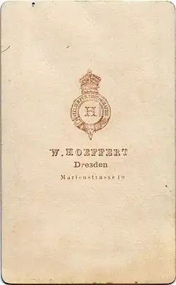 Höffert presumably returned to Germany in the same year and opened a photographic studio in Dresden under his name.[5] Höffert was one of the first photographers to become entrepreneurial, setting up photographic studios under the name "W. Höffert" in several cities and/or had them operated. The names of the operators/studio owners were in many cases not known,[6] The business relationships do not seem to have been clear. Only the photographer Georg Brokesch called himself managing director of the Leipzig studio from 1872 to 1875.