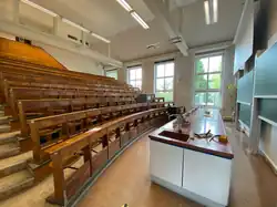 The U-shaped building had been furnished according to the most modern standards of the time: In the basement there was a large and a small battery, on the 1st floor there was a large workroom and equipment rooms, and on the 2nd floor there were two lecture halls (with 140 and 42 seats, respectively). In the attic there was a geological collection. There was also a director's apartment, located in the middle of the institute building and connected to the rest of the building by a corridor.[1]