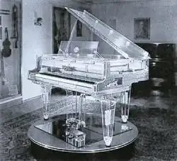 1952 Schimmel Pianos caused a sensation with the presentation of the first transparent acrylic glass piano.[9] The glass piano was improved 30 years later by Nicholas Schimmel. The piano soon became famous as it toured the world with the entertainer Udo Jürgens. Today the glass piano is highly demanded for TV shows, concerts tours and stages.