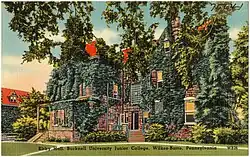 Wilkes University was first established in 1933 by Bucknell University under the name "Bucknell University Junior College" (BUJC) in Wilkes-Barre.[12] Frank G. Davis, chair of the Education department at Bucknell, first developed the idea of BUJC and served as an early liaison between BUJC and Bucknell.[13] BUJC attracted many students who were the first members of their families to benefit from higher education as the need for junior colleges arose in urban areas.[7] The college opened in downtown Wilkes-Barre, where the first classes were held on the third floor of the Wilkes-Barre Business College building.[7] By 1934, the business college moved out of the building and BUJC had taken it over and continued to grow over the years, acquiring old mansions for student housing, classrooms, and administration offices along the streets of South River and South Franklin.[7] By 1945, the board of trustees formally moved to develop the junior college into a four-year institution.[14]