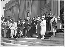 In 1915, he became an unpaid pastor of Westbourne Baptist Church in Calgary.[14] In 1918, he founded a Bible study group in the church, which grew in attendance over the years. In 1920 he was baptized by immersion.[15] In 1925, he broadcast his Sunday sermons on the radio station CFCN, which allowed him to broadcast his prophetic preaching to listeners throughout the Canadian prairies and part of the northern United States. In 1927 he made the decision to terminate the church's affiliation with the Baptist Union of Western Canada due to theological differences with the teachings given at the union college.[16] In 1927, he founded the Calgary Prophetic Bible Institute in a new building.[17] The institute building also housed the Westbourne Baptist Church. In 1929, a section of church members who disagreed with his beliefs about the need for a baptism of the Holy Spirit separate from conversion, decided to return to the old building, prompting Aberhart to found Bible Institute Baptist Church.[16] Towards the end of his life British Israelism became increasingly central to his theology.[18] British Israelism had been an element of his theology from an early stage, but assumed further importance following the 1939 royal tour of Canada where he spoke with King George VI on the topic.[4]: 284