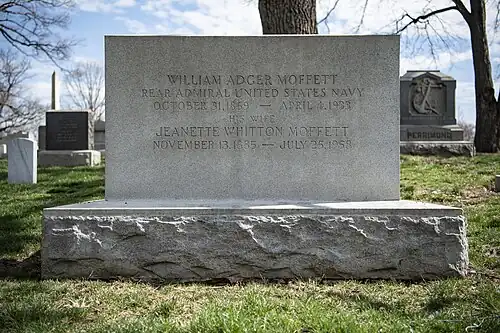 He is buried in Arlington National Cemetery, alongside his wife Jeanette Whitton Moffett (1885–1958),[4] and one of their three sons, William Adger Moffett, Jr. (1910–2001), who was also a Navy admiral.