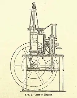 William Barnett was an engineer involved in the early development of internal combustion engines, and his work and patent are described over several pages in Dugald Clerk's book on Gas and Oil Engines.[3] In Barnett's UK patent (No 7615 of 1838), which was entitled "Production of motive-power",[4] Clerk states that "Barnett's inventions as described in his specification are so important that they require more complete description than has been accorded to earlier inventors", and he then proceeds to discuss Barnett's patent over several pages.