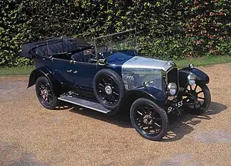After the Great War, Beardmore manufactured cars and London-type taxis under their own name. The first car was the 1486cc, four-cylinder 11.4, which had a 4-cylinder overhead camshaft (OHC) engine. It was manufactured at Anniesland, Glasgow and introduced at Olympia in 1919. The shaft drive to the camshaft proved to be unreliable and it was replaced by a chain. The engine was increased in capacity to 1854 cc and the car, renamed as the 12/30 was introduced in June 1923. This new engine was used, in 1923 in the new Super Sports. It was priced at £750 and each car came with a certificate that guaranteed that it had been driven around Brooklands track at 70 mph (110 km/h).[30] A highly modified version of the Super Sports, with a 2-litre engine broke the course record at the Shelsley Walsh hill climb in 1924.[31]