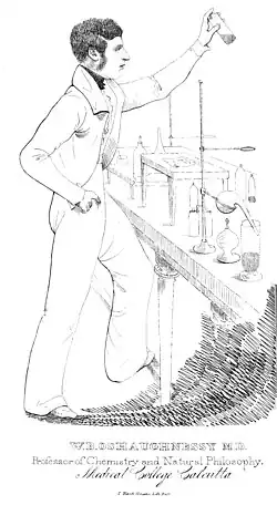 His first stint in India was marked by work in the subjects of botanical pharmacology, chemistry, galvanic electricity, and underwater conduction, among others. He worked on modifications to the Daniell cell and the use of tanned leather semi-permeable membranes in them. He identified the use of zinc to reduce the rusting of iron before the process of galvanizing had been established. O'Shaughnessy also analyzed the gun-cotton developed by Christian Friedrich Schönbein and recognized the role of nitrogen and correctly identified the role of sulphuric acid in removing water from the cotton. He also developed a silver chloride electrode[10] and experimented on adding colour tones to the Daguerre photographic process.[12] At Calcutta, he was a member of the Medical and Physical Society of Calcutta, where he published one of his first papers on medical applications of cannabis.[13] He validated folk uses of cannabis in India, discovered new applications, and ultimately recommended cannabis for a great variety of therapeutic purposes. O'Shaughnessy established his reputation by successfully relieving the pain of rheumatism and stilling the convulsions of an infant with cannabis. He eventually popularized its use back in England. His most famous success came when he quelled the wrenching muscle spasm of tetanus and rabies with resin. While he could not cure tetanus, he observed that the cannabis mixture reduced their symptoms of spasticity and their suffering. In 1837 he published his independent design of an electric motor.[14][15] In 1839, O'Shaughnessy conducted experiments on an experimental telegraphy system that he set up in the Botanical Garden at Calcutta with the assistance of Nathaniel Wallich. A length of 22 miles of wire was laid by zigzagging them over bamboo posts.[16] In 1841, he returned to England, where he introduced Cannabis indica to Western medicine and continued his scientific writings.[17] He was a member of the London Electrical Society and was elected a fellow of the Royal Society on 16 March 1843. The Candidature for Election to Fellow of the Royal Society stated that he was "distinguished for his acquaintance with the science of Medicine and Chemistry, eminent as a Physician and as a promoter of education among the natives of Bengal". O'Shaughnessy was a supporter of the idea of education in native languages in medicine. He also wanted locally available sources of medicine to be utilized to provide inexpensive aid. As a teacher, he took students on field trips to the Botanical Garden to introduce them to the local medicinal plants. In 1837 he prepared a Manual of Chemistry of which a thousand copies were printed for use in Calcutta. A second edition was produced in 1842. Another major book was the Bengal Dispensatory and Pharmacopeia which included an appendix on the "improvement of Bengal pottery" (1840) since earthenware imports from Europe were proving to be expensive. The Bengal Dispensatory included descriptions of several plant species that were made or overseen by Wallich including those of Abelmoschus longifolius, Pharbitis caerulea, Hebradendron pictorium and Garcinia pictoria.[18] These descriptions have often been overlooked by botanists in the past.[19][11][20]