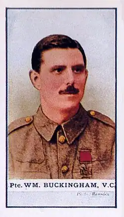 Private William Buckingham VC (February 1886 – 15 September 1916) was an English recipient of the Victoria Cross (VC), the highest and most prestigious award for gallantry in the face of the enemy that can be awarded to British and Commonwealth forces. He received the VC during the First World War, for his actions during the Battle of Neuve Chapelle in March 1915. He was killed the following year at Thiepval.