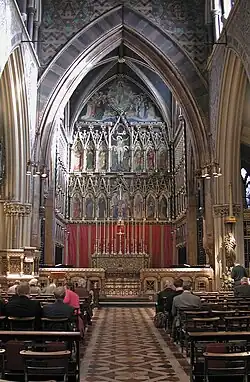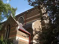 Butterfield's church of All Saints, Margaret Street, London, was, in the view of Henry-Russell Hitchcock, the building that initiated the High Victorian Gothic era. It was designed in 1850, completed externally by 1853 and consecrated in 1859.[1] Flanked by a clergy house and school, it was intended as a "model" church by its sponsors, the Ecclesiological Society. The church was built of red-brick, a material long out of use in London, patterned with bands of black brick, the first use of polychrome brick in the city, with bands of stone on the spire. The interior was even more richly decorated, with marble and tile marquetry.[1]