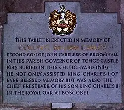 Colonel William Careless (surname variants include Carelesse, Carless, Carles and Carlis)[1] (died 1689) was a Royalist officer of the English Civil War. It has been estimated in various written sources that he was born c. 1620, however, it is more likely that he was born c. 1610.[2] He was the second son of John Careless of Broom Hall, Brewood, Staffordshire, and his wife Ellen Fluit.[3][4][5] He is chiefly remembered as the companion of King Charles II when the fugitive monarch hid in the Royal Oak following his defeat at the Battle of Worcester. His surname was changed to Carlos, the Spanish for Charles, by order of Charles II. He died in 1689.