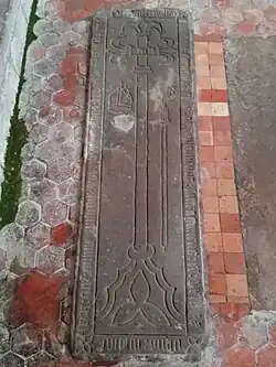 Dudley's tombstone in Brinkburn Priory. The Latin inscription reads "Here lies William former Bishop of Cluny and Suffragan of Durham and Prior of the Monastery whose soul has returned to God. He died AD 1484."