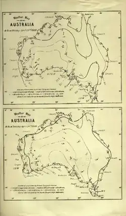 Cooke developed an interest in the development of low pressure zones which often dominated the weather cycles, and the possibility of tracking these depressions. He studied weather records from the Cape of Good Hope, Natal and Mauritius with the hope of associating weather events there with later events in Australia. He analysed and mapped the passage of cyclones from the North-West into the interior, publishing cyclone forecasts for the first time. In 1908 the meteorology service was taken over by the Commonwealth, enabling him to concentrate on astronomical projects.