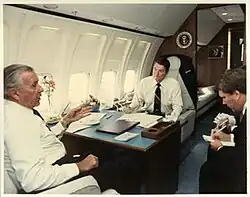In preparation for major visits abroad and in the Oval office, as well as visits outside the United States, Martin would sometimes do the first draft of the President's weekly radio address in close coordination with Presidential chief speech writer Ben Elliott. Three of these addresses were especially important. First, Reagan's radio address in 1984 following his first meeting with a Soviet leader (Foreign Minister Gromyko) after four years in office.[14] This widely quoted radio address, highlighted in headlines on the front page of the Washington Post set the agenda and tone for the subsequent meeting with Soviet leader Gorbachev one year later. Reagan recognized Martin's role in its drafting in the following letter.[2] Second, Martin prepared a radio address describing the G-7 Economic Meeting chaired by Margaret Thatcher in 1984.[2] And third, he prepared a radio address in 1983 describing the President's visit to Japan and Korea.[2]