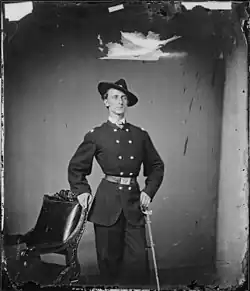 The 49th Massachusetts was assigned in late November 1862 to the Louisiana expedition of Maj. Gen. Nathaniel P. Banks. The aim of the expedition was to increase the number of Union soldiers in the Army Department of the Gulf and to conquer the few remaining Confederate strongholds on the Mississippi River, thus opening that waterway to the Union. Bartlett led his regiment during the Siege of Port Hudson in Louisiana in the spring of 1863. Due to the amputation of his leg, he was required to remain on horseback during battle, making him an easy target for Confederates.[4] During one of several assaults on Port Hudson on May 27, 1863, Bartlett was shot twice— a bullet shattered his left wrist, while buckshot struck his right leg. The regimental surgeon, Dr. Frederick Winsor, was able to remove the bullet and save his hand, but the wounds effectively removed him from command until the end of the 49th's term of service in September 1863.[4] Bartlett resigned his commission on September 1, 1863.[1]