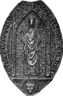 The seal of Bishop William Fraser. The other side contains his arms, making this the earliest episcopal seal from the British Isles on which the arms are represented.