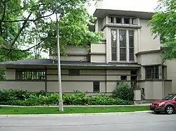 The William G. Fricke House is a home designed by American architect Frank Lloyd Wright at 540 Fair Oaks Avenue[1] in Oak Park, Illinois, United States. Fricke commissioned the home in 1901 and it was finished the next year. Wright used elements in the building that would appear in his Prairie style homes: a high water table, horizontal banding, overhanging eaves, shallow hipped roofs, and an exterior with an expansive amount of stucco.[2] Wright usually emphasized the horizontal in his house designs, but the Fricke house is different by having a three-story tower.