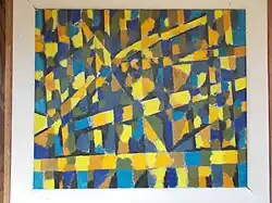 Between 1947 and 1950 Gear lived and worked in Paris,[3] where he met Eduardo Paolozzi, Alan Davie, Stephen Gilbert and many of the leading post-war generation of Parisian artists including Atlan, Da Silva, De Staël, Dubuffet, Hartung, Mathieu, Pignon, Poliakoff, Schoffer, Singier, Soulages and Zadkine. In 1948 he held his first Paris and London solo exhibitions, and visited Terry Frost, Patrick Heron, Roger Hilton, Peter Lanyon and Bryan Winter in St Ives. After meeting Appel, Constant, Corneille, and Jorn, he joined and exhibited with the North European avant-garde CoBrA art group[2] in Amsterdam during 1949. That year he also co-exhibited with Jackson Pollock in New York, married an American citizen, Charlotte Chertok (1920–88), and his son David was born. While holidaying in Brittany in 1950, he was visited by William Scott.