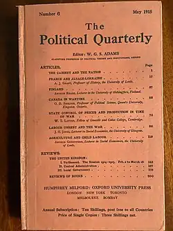 Seven further issues followed, with substantial editorials by Adams and articles by Arnold Toynbee, Lewis Namier, Arthur Greenwood, R. H. Tawney and Ernest Barker, before publication was suspended at the end of 1916 owing to war "service in the field or at home".[28] The Political Quarterly did not appear again until the title was revived in 1930 by a group including Leonard Woolf, J. M. Keynes and Harold Laski.[29]