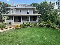 Exterior photo of The William H. Copeland House showing Wright's work on the roof line, attic dormers, and wraparound porch.