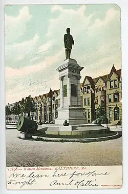A monument to Watson exists at the corner of West North Avenue and Mount Royal Terrace in Baltimore near the old Gateway Entrance Pillars to Druid Hill Park where it was re-located in 1930. Previously, the Monument with its ten-foot bronze statue by famed local artist Edward Berge, (1876–1924), placed on a granite pedestal, flanked by two captured Mexican Army mortars was erected and dedicated in late September 1903, on the 57th anniversary of his death at the Storming of Monterrey in Mexico on September 22, 1846. Bronze plaques on either side of the pedestal record the names of those killed in the engagement, the surviving members of the Maryland Association of Veterans of the Mexican War, the deceased members of the Veterans, and the members of the Monument/Memorial Committee. It was unveiled by his sole surviving child—a daughter, Monterey Watson Iglehart, who was born on the day her father was killed. The statue was covered by the same U.S. flag that shrouded his body when it left Mexico to be transported home. The main speaker and orator for the ceremonies that day was Edwin Warfield (1848–1920), who was the founder (1890) and president of the influential Fidelity and Deposit Trust Company of Maryland (located in a landmark granite skyscraper headquarters, built 1894, at North Charles and West Lexington Streets (it was one of only a few tall older buildings which were not razed in the late 1950s and 1960s, during the re-development of the central business district known as Charles Center, and was still standing in 2013). Warfield was elected the next year as the 45th Governor of Maryland (1904–1908). Several other Baltimore and Maryland officials were joined by surviving veterans and their leaders along with representatives of other veterans groups from other wars. The original site of the Watson Monument when it was dedicated was at the intersection of West Mount Royal Avenue and West Lanvale Street, several blocks southwest of its later location. It was moved back then in 1930 because of a planned extension to the north of North Howard Street.