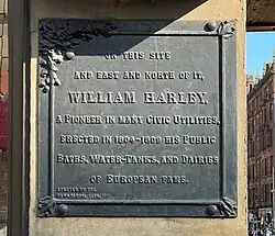 About 1804, at a time when people had to queue at wells within the city to pump water, Harley also started a business piping fresh water from springs on his Willowbank property west to a reservoir tank on the northeast corner of what is now Bath Street and West Nile Street, and selling it twice a day directly to people's doors via water tanks on carts.[4][1][3] However, when the very new Glasgow Waterworks Company and Cranstonhill Company started pumping water from the River Clyde direct to people's homes, Harley's water distribution business switched to service another of his new projects, the creation of the first indoor public baths in Scotland. Bath Street was later named after these baths.[1][3][6]
