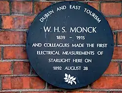 In 1892, Monck, George F. Fitzgerald, and his neighbour S.M. Dixon created the first electrical measurements of starlight using photovoltaic cells which were made by George M. Minchin.[8] These measurements were taken from a telescope in his back garden. A plaque to honour the location of the first electric measurements of starlight was unveiled at 16 Earlsfort Terrace on 6 April 1987.[9]