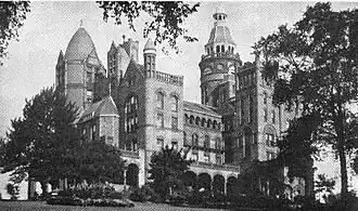 In 1894 he built the Webb Academy and Home for Shipbuilders,[17] in the Fordham section of the Bronx (now the site of Fordham Hill Apartments) and provided an endowment for its running estimated at $2,000,000.[4] The main purpose of the Academy was in the words of its charter to "furnish gratuitous education in the art, science and profession of shipbuilding".[3] Tuition for the students, who were carefully selected on the basis of aptitude and lack of means, was free. The facility also provided a free home to old shipbuilders, including a number of Webb's own former employees. By 1899 the Academy was providing facilities to about 400 students and retirees.[3] The Academy is known today as the Webb Institute.[2]