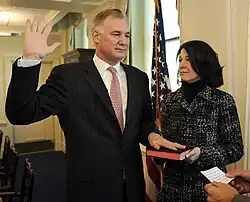 On January 8, 2009, President-elect Barack Obama nominated Lynn as his Deputy Secretary of Defense.[7] This was complicated by the fact that new ethic rules promulgated by Obama for members of his administration created a waiting period of two years between lobbying activities and working for the administration on the same issues, which Lynn's work with Raytheon violated.[8] President Obama waived the new rules for Lynn, which received criticism from John McCain as well as outside groups such as the Project on Government Oversight, Citizens for Responsibility and Ethics in Washington, Government Accountability Project, and Public Citizen.[9] McCain later said that the nomination should probably move forward.[10] As nominee, Lynn agreed to sell his holdings of Raytheon stock.[11] Lynn's appointment was approved by the U.S. Senate Armed Services Committee on February 5, 2009, by unanimous consent.[12] On February 11, 2009, Lynn was confirmed in the full Senate by a vote of 93–4.[13] He took the oath of office on February 12.