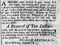 On behalf of Louisiana sugar planter Joseph Erwin, William Kenner's company placed a runaway slave seeking the capture of Roger, Sam, and a 'dark mulatto man,' all born in Virginia (Louisiana Gazette, October 24, 1812)
