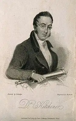 Kitchiner was born in 1778, the son of a prosperous merchant. His father's legacy meant he did not have to work, but instead was able to live on his own means.[7] Although claiming to have been educated at Eton and Glasgow, he attended neither institution, but the link to Glasgow enabled him to claim to be a medical doctor (M.D.), a claim no-one checked.
