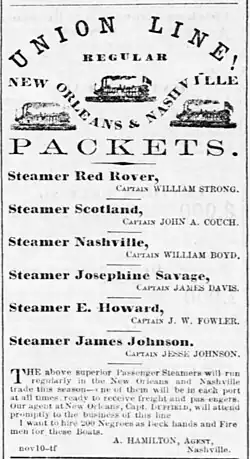 ![]() "Union Line! Regular New Orleans & Nashville Packets" – Steamer Nashville, Captain William Boyd – Daily Nashville Patriot, December 13, 1858 | |