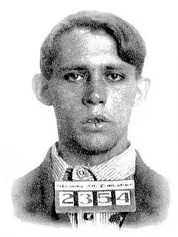 By early 1916 he was destitute, with only a nickel in his pocket; he decided the quickest way to obtain cash was to hold up a train. Carlisle robbed his first train in Wyoming on 9 February 1916 wearing a white bandana over his face and armed with a toy pistol and a .32-caliber pistol. During the robbery he gave coins to a guard to make up for his lost tips, gave a dollar to a man to pay for his breakfast and bowed to a woman who tried to take his gun from him.[5] He held up two more trains over the next two months. He was caught on 22 April 1916 and was sentenced to life imprisonment in the Wyoming State Penitentiary in Rawlins on 10 May 1916 after a two-day trial, even though he never shot anyone during the robberies and did not take money from women, children or servicemen. In prison he worked in the shirt factory.[1]