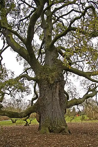 One of the early Lucombe Oaks went to Kew Gardens.[6] The current champion is at Powis Castle, Wales.[7] Lucombe Oaks along with their descendants, which include back crosses with the naturalized Turkey Oak, are common in the landscape of East Devon, as well as in parks and gardens. A number of Lucombe Oaks are planted in the grounds of County Hall in Exeter - the headquarters of Devon County Council. The Tree Register of the British Isles−TROBI Champion is at Phear Park in Exmouth, measuring 26 metres (85 ft) in height, with a trunk diameter of 261 centimetres (103 in) in 2008.[8]>